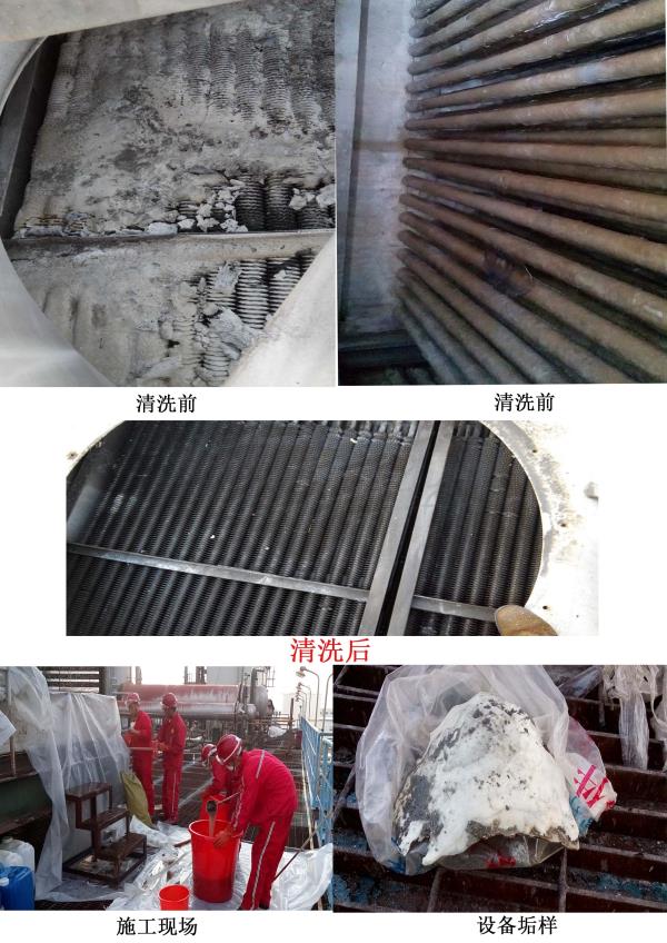 復(fù)合型蒸發(fā)式冷卻器上部是風(fēng)冷式,下部為水冷式。因此上部翅片管束表面由于接觸環(huán)境大氣、易于積存油膩、塵垢、煙垢、柳絮等附著物,形成較大的熱阻,污垢的存在將大大降低甚至喪失鋁翅片冷換設(shè)備的冷卻作用。另外鋁翅片表面的污垢也會(huì)促使垢下腐蝕。下部水冷式光管表面由于外部環(huán)境條件影響,并且由蒸發(fā)式空冷器的特點(diǎn),造成循環(huán)冷卻水濃縮快,濃縮倍率高,硬度,堿度高,濁度高等困難。在長期運(yùn)行過程中,空冷器光管束表面生成了很厚的硬垢,嚴(yán)重影響了空冷器換熱效果,增加了能耗,影響了正常生產(chǎn)和安全。為了保證設(shè)備安全,穩(wěn)定運(yùn)行,延長使用壽命,提高冷卻效率,應(yīng)對(duì)其進(jìn)行定期清洗。