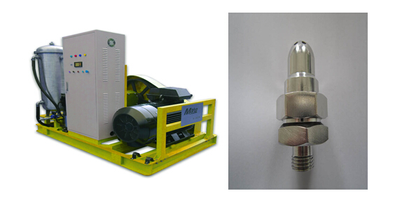高壓射流清洗:是使用高壓泵打出高壓水,并經(jīng)過一定管路到達(dá)噴嘴,再把高壓力低流速的水轉(zhuǎn)換為高壓力高流速的射流,然后射流以其很高的沖擊動能,連續(xù)不斷地作用在被清洗表面,從而使垢物脫落,最終實(shí)現(xiàn)清洗目的。